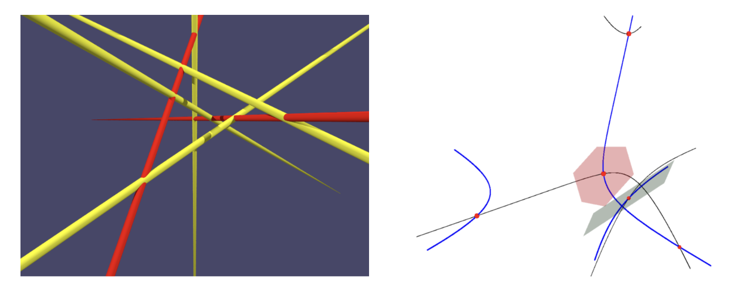 In complex projective space, for a generic choice of four lines, the answer is 2, as shown by the red lines above. To deduce this using standard analytic/geometric methods alone is possible but cumbersome; the equations involved lead to a quadratic equation when solved, which has two solutions in general. But the magic of Schubert calculus is that that “2” can be computed as a much simpler combinatorial calculation:
