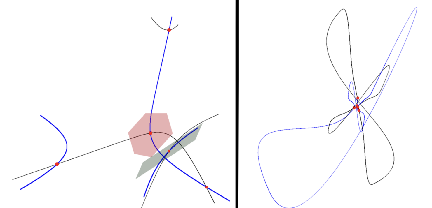 In order to get a handle on problems like Question 2, we first consider the question without the two tangent planes: how many degree 3 curves pass through the 5 given points in 3-space? The answer is now infinitely many, and in fact we have a two-parameter family of such curves. This defines a two-dimensional moduli space, which Kapranov showed is isomorphic to the space $M_{0,n}$. The latter, we explored briefly in this previous post. If we allow our cubics to be degenerate, such as a line through two of the points union with a plane through three, then the solutions are parameterized by the Deligne-Mumford compactification $\overline{M}_{0,n}$.