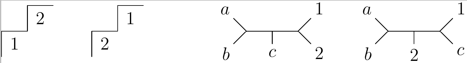 Just as in Schubert calculus, there is an abstract way of figuring out the generic answer of “2” via intersection theory, and the associated combinatorics is just starting to be uncovered. Instead of Young tableaux and puzzles, we have parking functions and trees. At left below are the two standard parking functions of shape $(1,1)$, and at right are the two trivalent “slide trees” shown to correspond to this intersection problem in this paper.