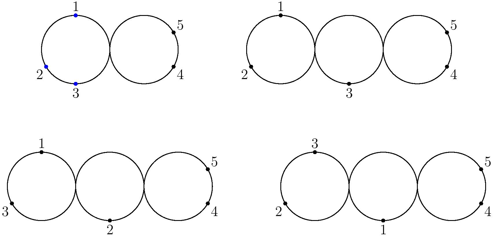 and all further degenerations along this locus, namely the three “boundary” points in which we can think of the $4,5$ bubble as colliding with $1$, $2$, or $3$, as shown in the other three diagrams above. The four pictures above together form a boundary stratum, meaning the closure in $\overline{M}_{0,5}$ of the set of all curves with a given dual tree.
