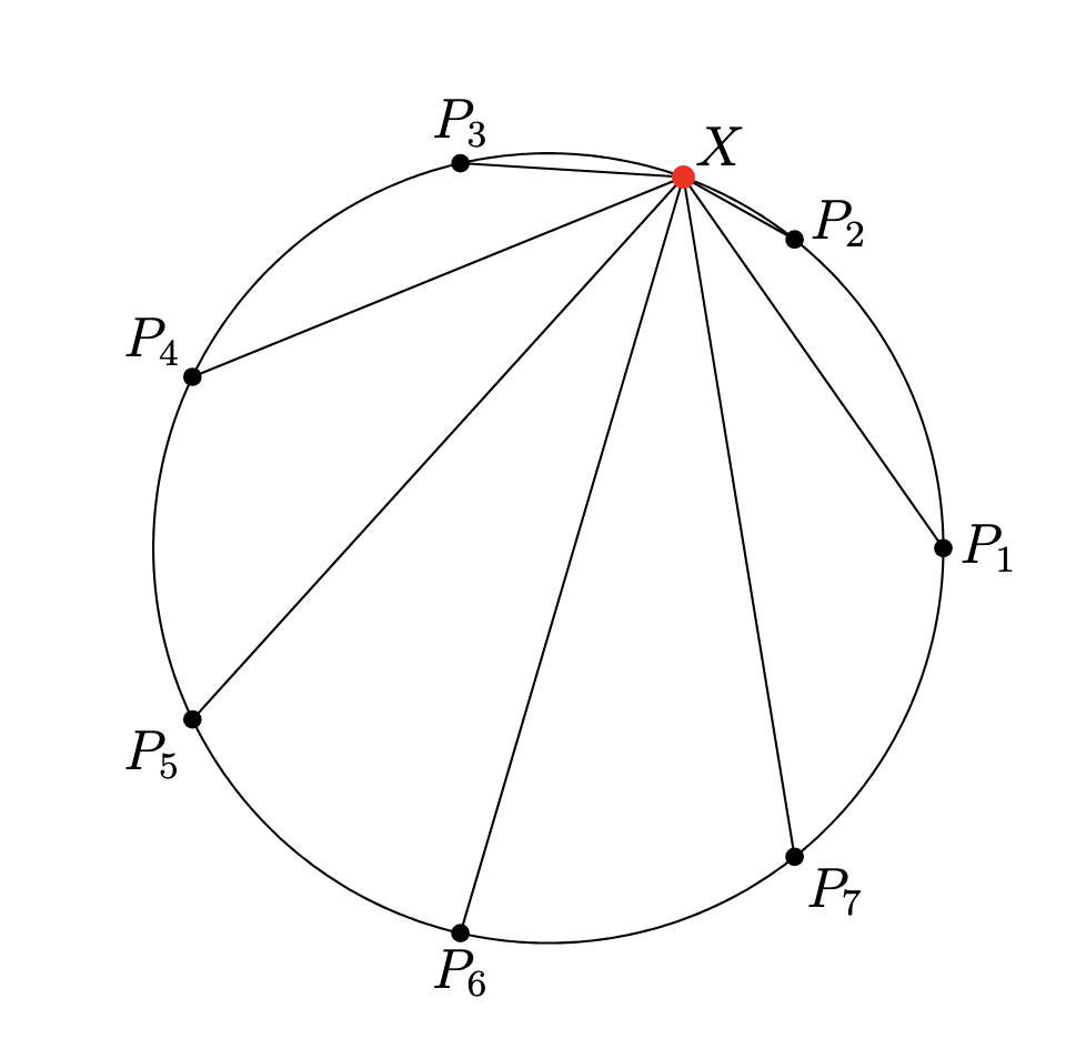 Now let’s center the circle at the origin in the complex plane, and rotate it so that point $P_1$ is at $1$. Then we can write $X=e^{i\theta}$ for some angle $\theta$, and $P_k=e^{2\pi i k/n}$ for all $k$. Then using the complex numbers facts that $|z|=z\overline{z}$ and $\overline{e^{i\theta}}=e^{-i\theta}$, the sum becomes