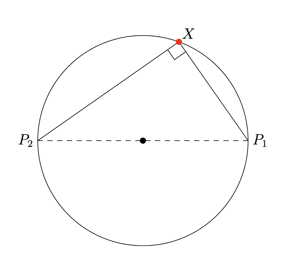 It’s fun to first prove this for $n=2$. In this case, the two chords $XP_1$ and $XP_2$ form a right angle because $P_1P_2$ is a diameter of the circle (and the angle spanning ). So by the Pythagorean theorem the sum of their squares is the square of the hypothenuse (diameter), which $(2r)^2=4r^2$, as desired: