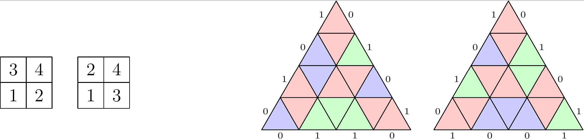 The two arrangements, called Young tableaux, are shown above at left. There are also other combinatorial solutions now as well, such as Knutson-Tao puzzles (shown above at right, also the two corresponding to the solution to Question 1) and Schubert calculus is the art of building a dictionary between combinatorial operations, invariants, and algorithms and the corresponding geometric properties in intersection theory.