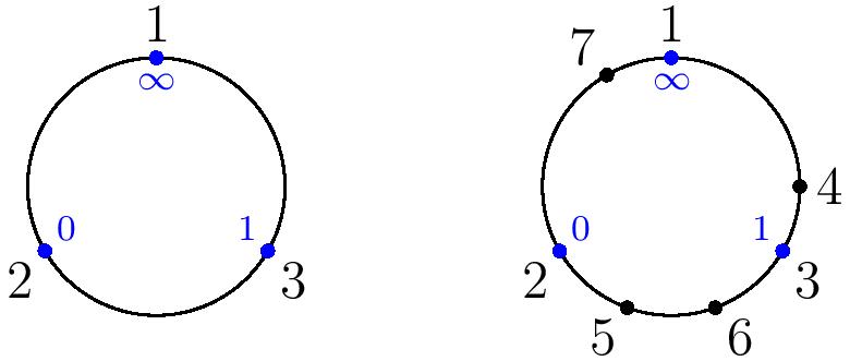 Indeed, for the purposes of this post we will usually assume $\mathbb{P}^1$ is the projective line over $\mathbb{C}$, but our constructions here can work over any field, and we will draw them as if we are over $\mathbb{R}$, meaning that $\mathbb{P}^1$ can be represented as a circle. In other words, we are choosing locations of $n$ beads on a necklace up to a projective transformation. And note that a projective transformation is determined by where it sends three points (see my expository work on Schubert calculus for background on projective transformations) and so we may without loss of generality set $p_1,p_2,p_3$ to be at the points $\infty=(1:0)$, $0=(0:1)$, and $1=(1:1)$ and then the other points may vary freely. An example of a point in $M_{0,7}$, using this notation, is shown below in the rightmost picture: