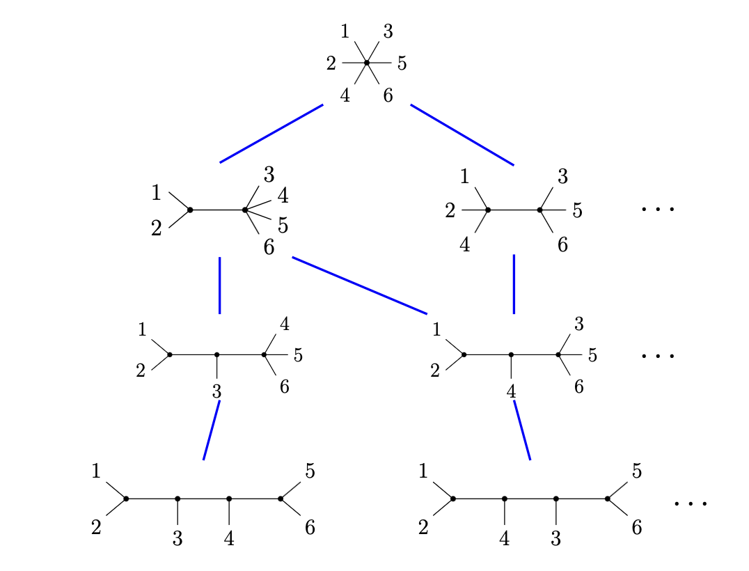The strata also form a partial ordering by containment, and the combinatorial structure is quite interesting; here is a partial picture of the poset of dual trees for $\overline{M}_{0,6}$: